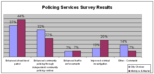 Results from both City Choices and Mustel Group surveys indicate that enhanced street level patrol to be the top priority.
