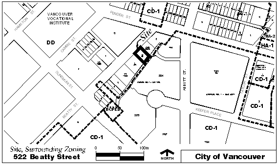 The site is located in Victory Square area of the City and is zoned Downtown District (see site map below). Gair Williamson Architect has submitted a Development Application (DE408442) proposing to rehabilitate the building as part of the redevelopment of the site and is seeking floor area and parking variances, a façade grant and transferable density in order to make the project economic.