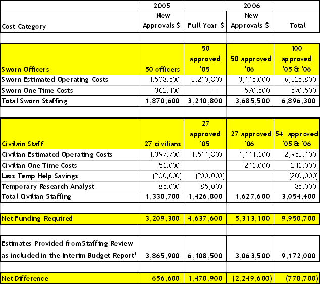 Appendix 3 specifically identifies the positions to be created in 2005 and 2006, while Table 1 below provides a summary of the financial implications.TABLE 1 - Vancouver Police Staffing Increase