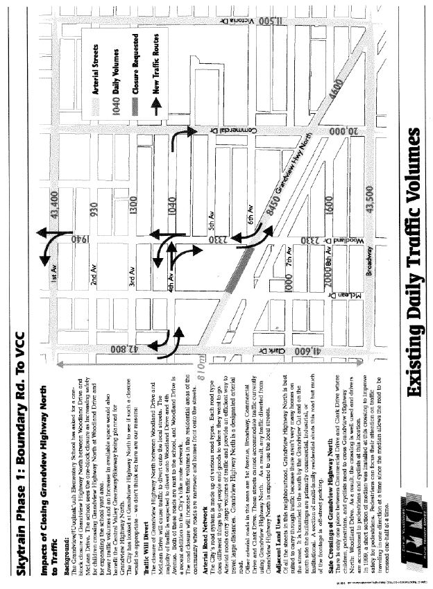 This balanced accommodation of improving the cycling and pedestrian environment but still accommodating some through traffic recognizes that Grandview Highway North in this area must continue to function as an integral part of the street system. Broadway cannot accommodate an increase in traffic; it is especially important to minimize traffic increases at Broadway and Commercial where there will be many more buses turning through this intersection once the Millennium SkyTrain line opens.